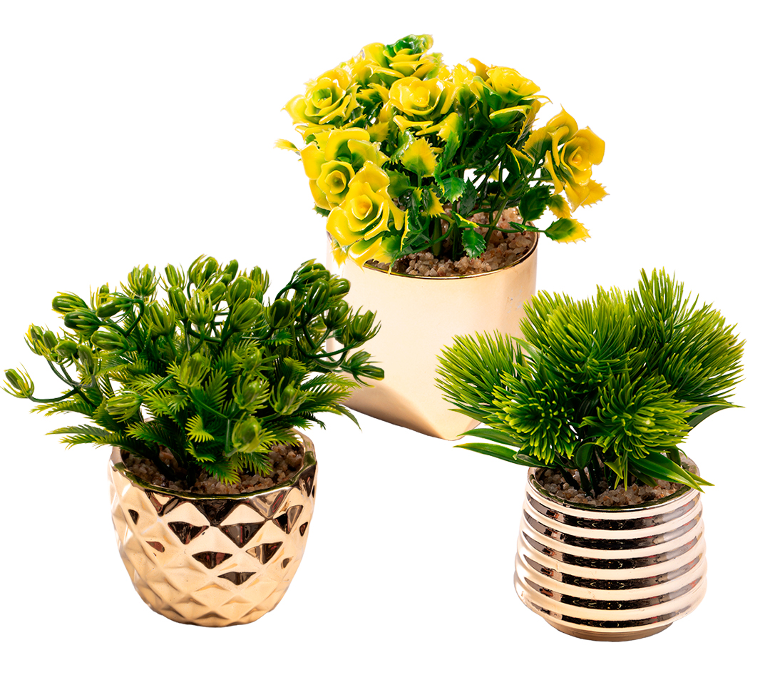 - Cantidad: 06 flores artificiales con materos de cerámica (02 de cada modelo)