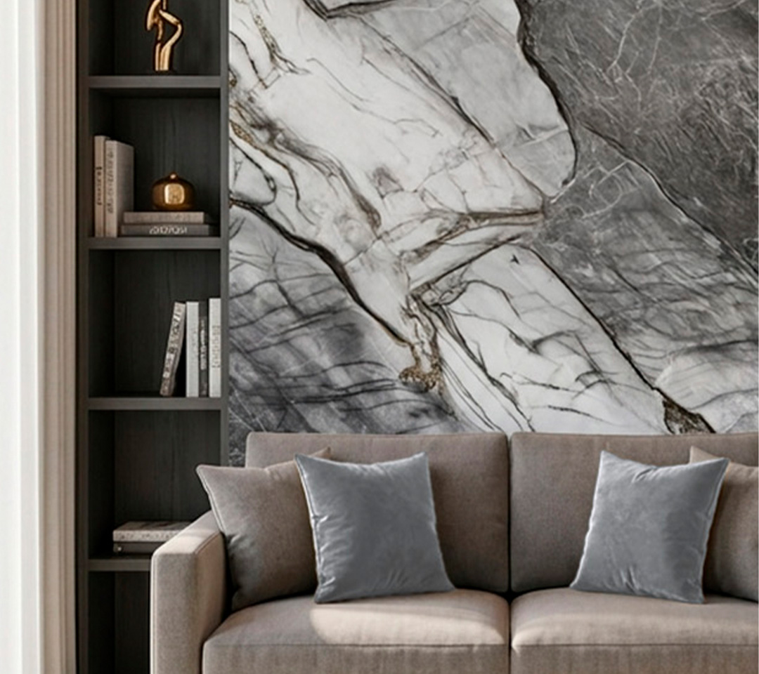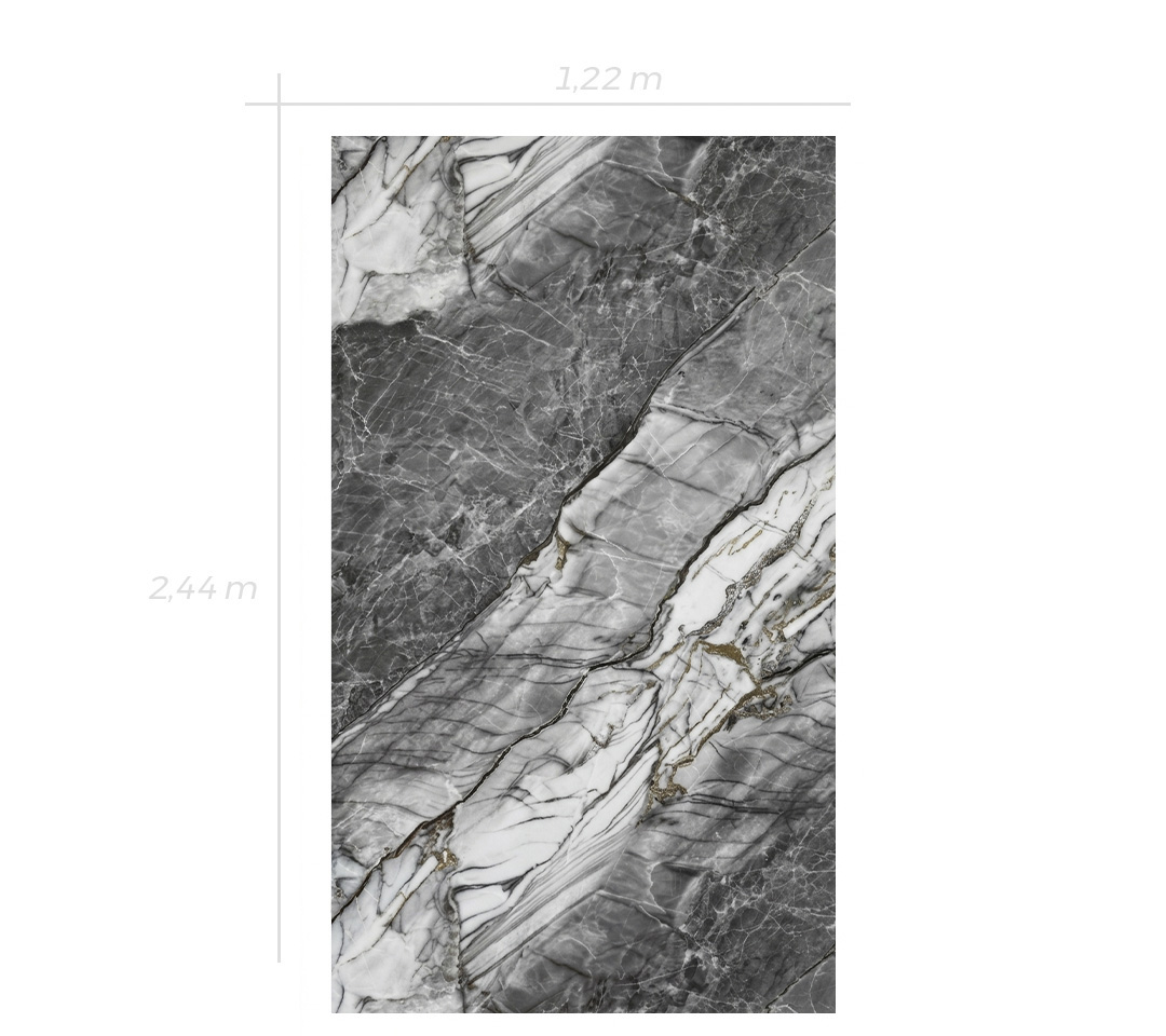 Aporta una estética industrial y sofisticada a tus paredes con la lámina Titanium Stone. Este modelo se aleja de los mármoles tradicionales para ofrecer un diseño más audaz, inspirado en la piedra de cantera con matices de titanio. Sus contrastes entre gris grafito y blanco crean una atmósfera de modernidad y solidez, ideal para quienes buscan un espacio con carácter arquitectónico.