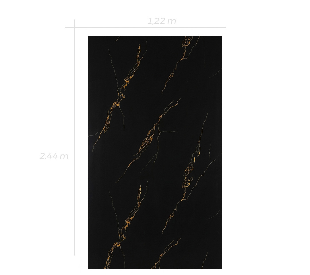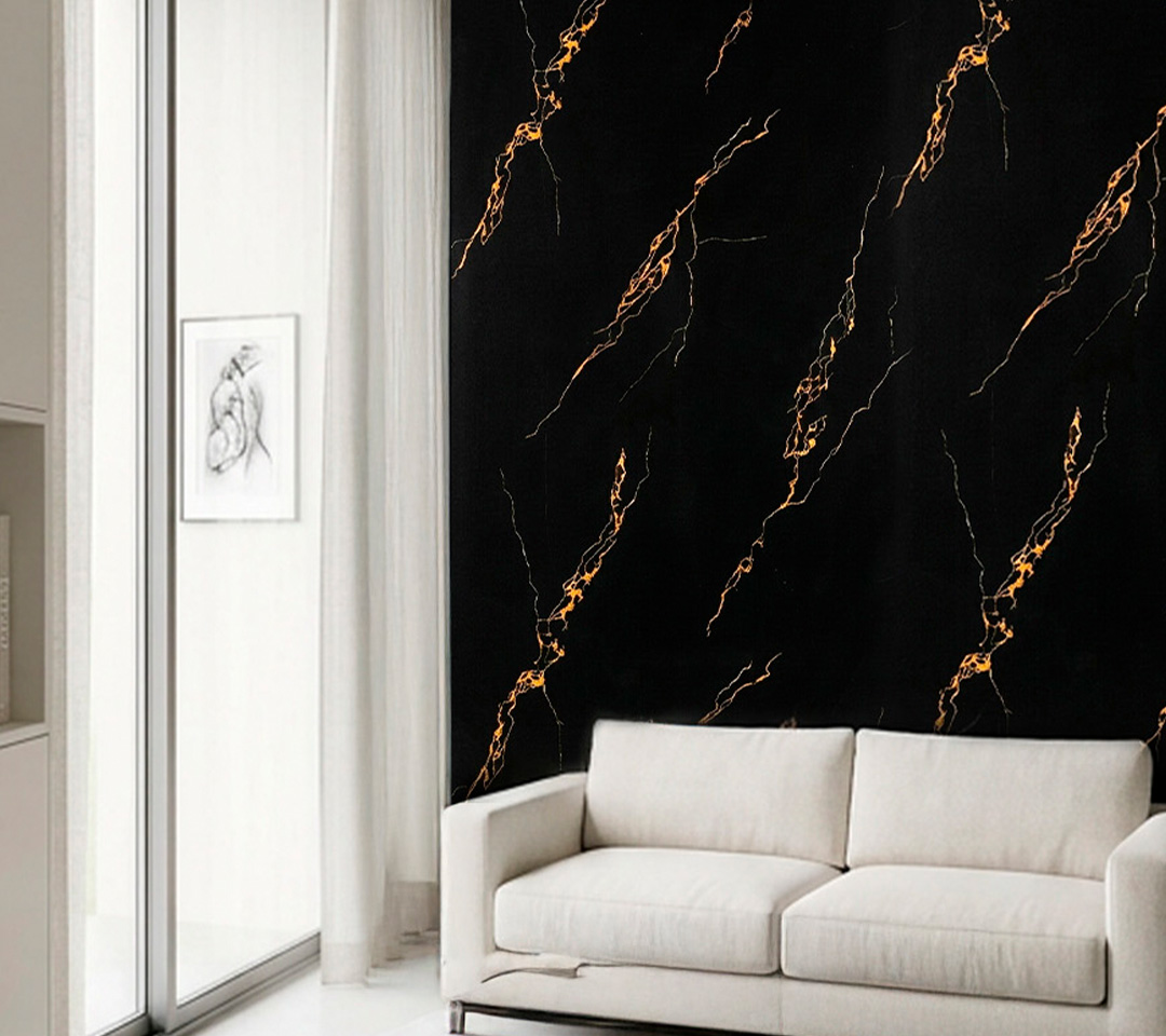 Transforma cualquier espacio con la sofisticación profunda de nuestra lámina Negro Imperial. Este revestimiento de alta gama combina una base negro mate intenso con vetas doradas orgánicas, logrando una estética de mármol exótico que aporta carácter y elegancia inmediata a tus paredes.