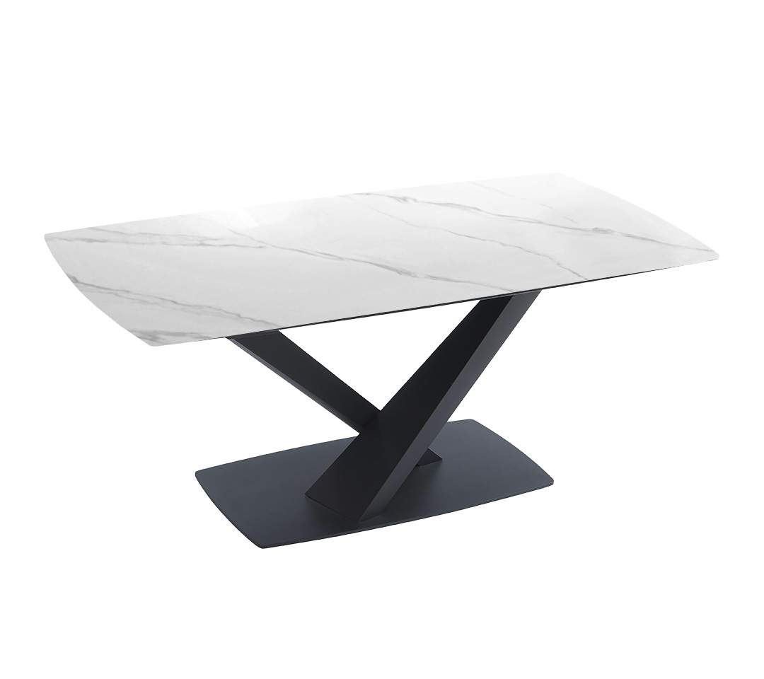 Con unas medidas de 140 cm de largo, 80 cm de ancho y 75 cm de alto, la Mesa Amsterdam cuenta con una superficie de mármol cerámico en un exquisito acabado blanco con vetas grises, que aporta un toque de sofisticación y lujo. Su base está compuesta por dos patas metálicas negras que se cruzan en forma de «X», proporcionando una estabilidad excepcional y un diseño vanguardista.
