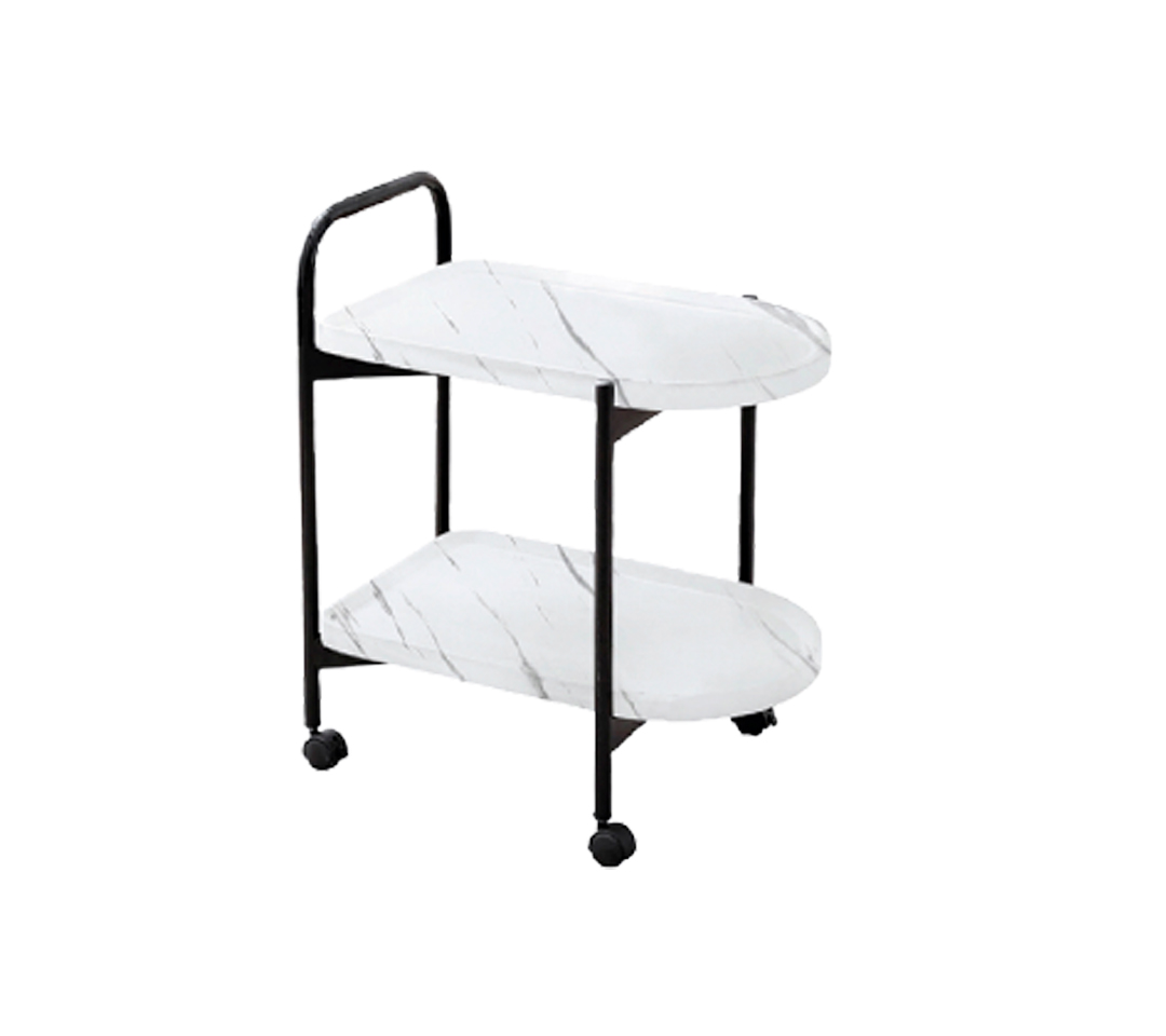 Su silueta ovalada, enmarcada por una estructura metálica negra, ofrece dos amplias bandejas para un almacenamiento accesible o para servir a tus invitados. Elige entre el sofisticado efecto mármol blanco o el cálido acabado en madera marrón para complementar tu decoración.