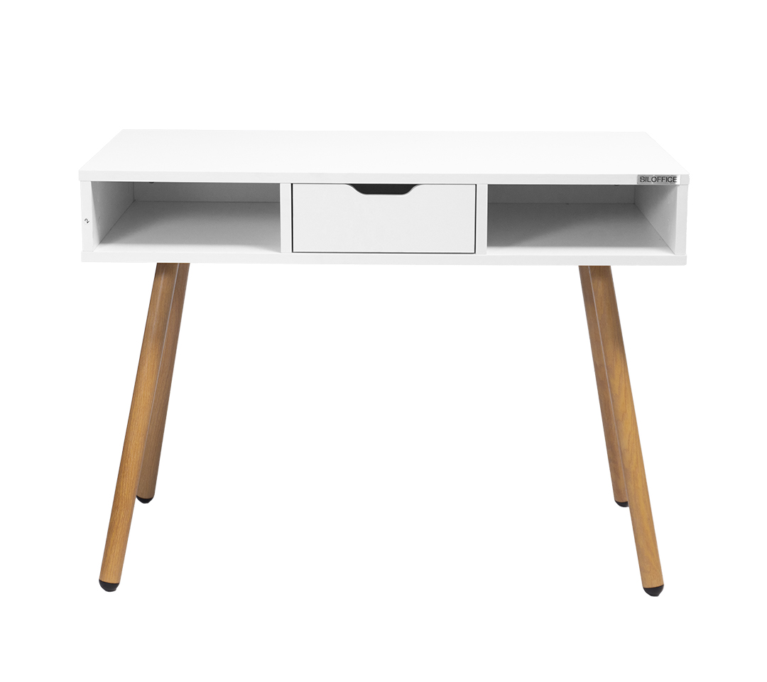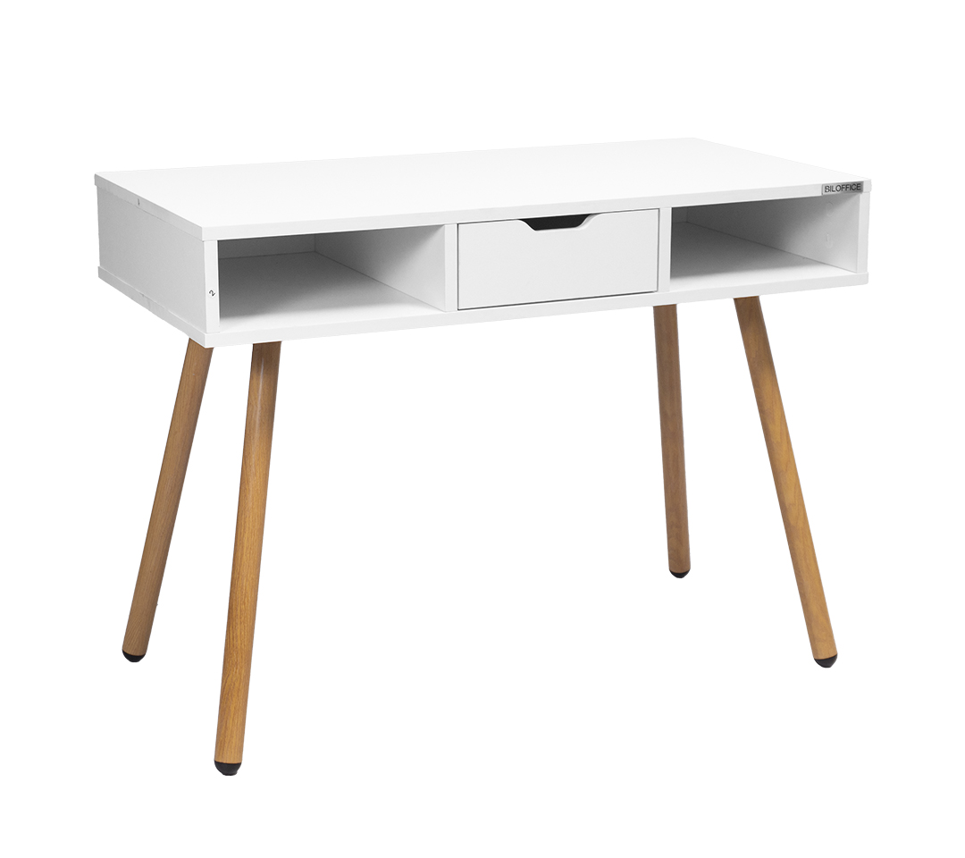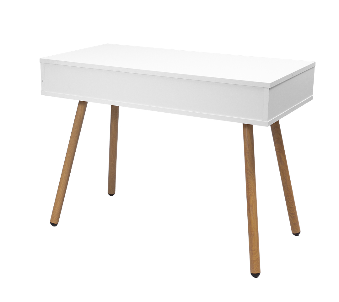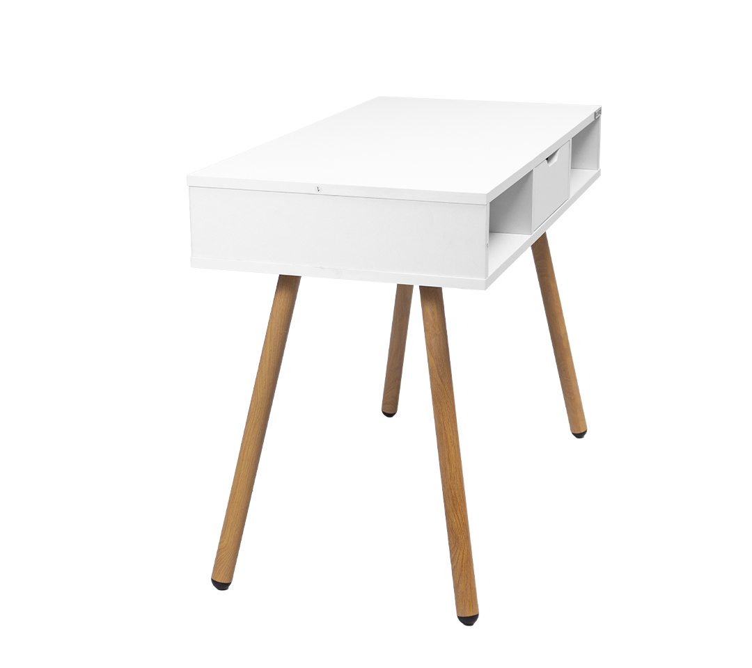 - Materiales: Superficie de madera con acabado blanco mate, combinada con patas de madera en tono natural, lo que aporta un estilo cálido y sofisticado.