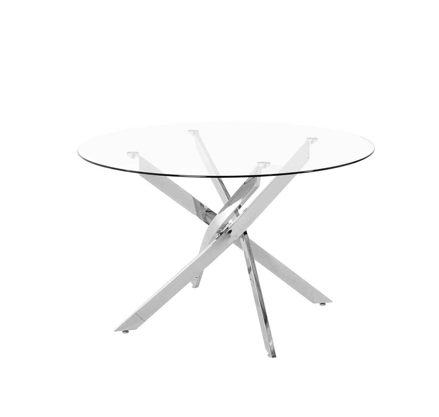 - Diseño Contemporáneo: Su tablero redondo de cristal transparente y la base de patas cruzadas en cromo pulido se combinan para ofrecer una estética vanguardista y limpia, que se integra sin esfuerzo en decoraciones modernas, industriales o minimalistas.