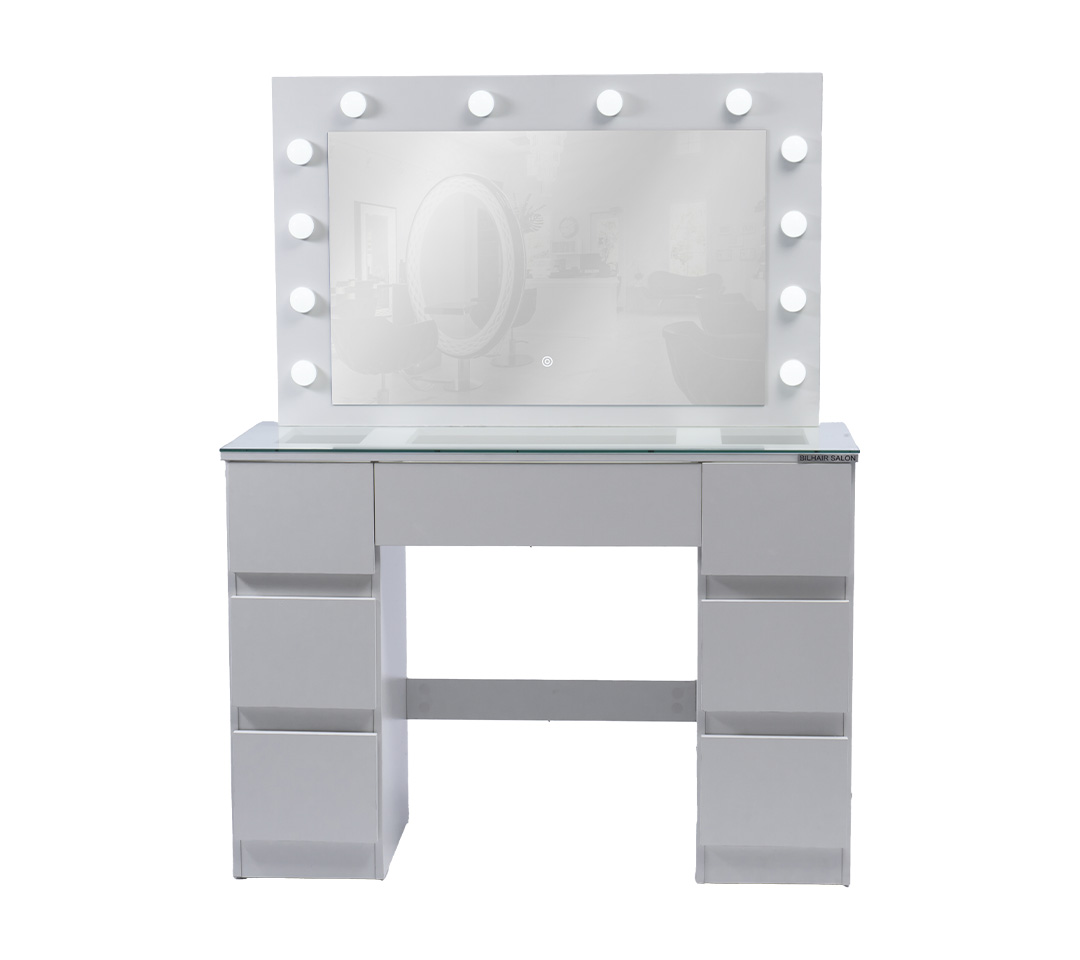 - Espejo Grande con Luces LED: El espejo rectangular está rodeado de bombillas LED brillantes, proporcionando una iluminación excelente para la aplicación de maquillaje y el peinado.