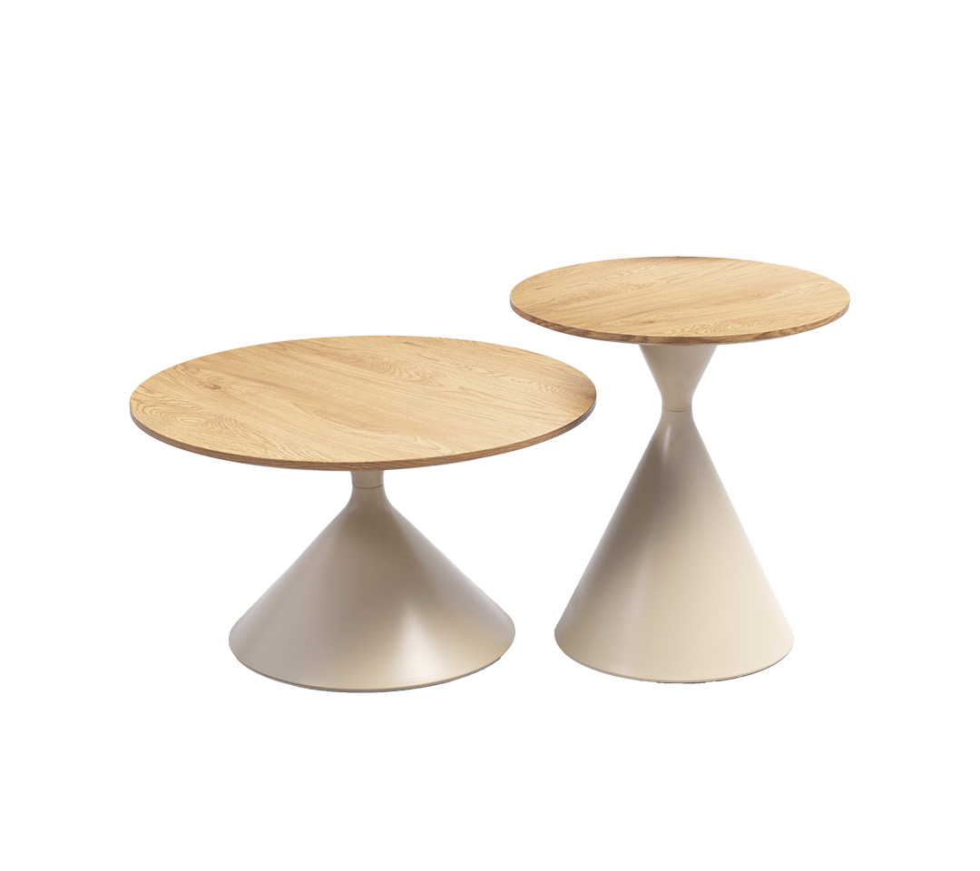 - Materiales: Superficie circular elaborada en madera de roble natural, que proporciona un acabado cálido y moderno. La base cónica está fabricada en material resistente con un elegante tono beige que contrasta de manera sofisticada.