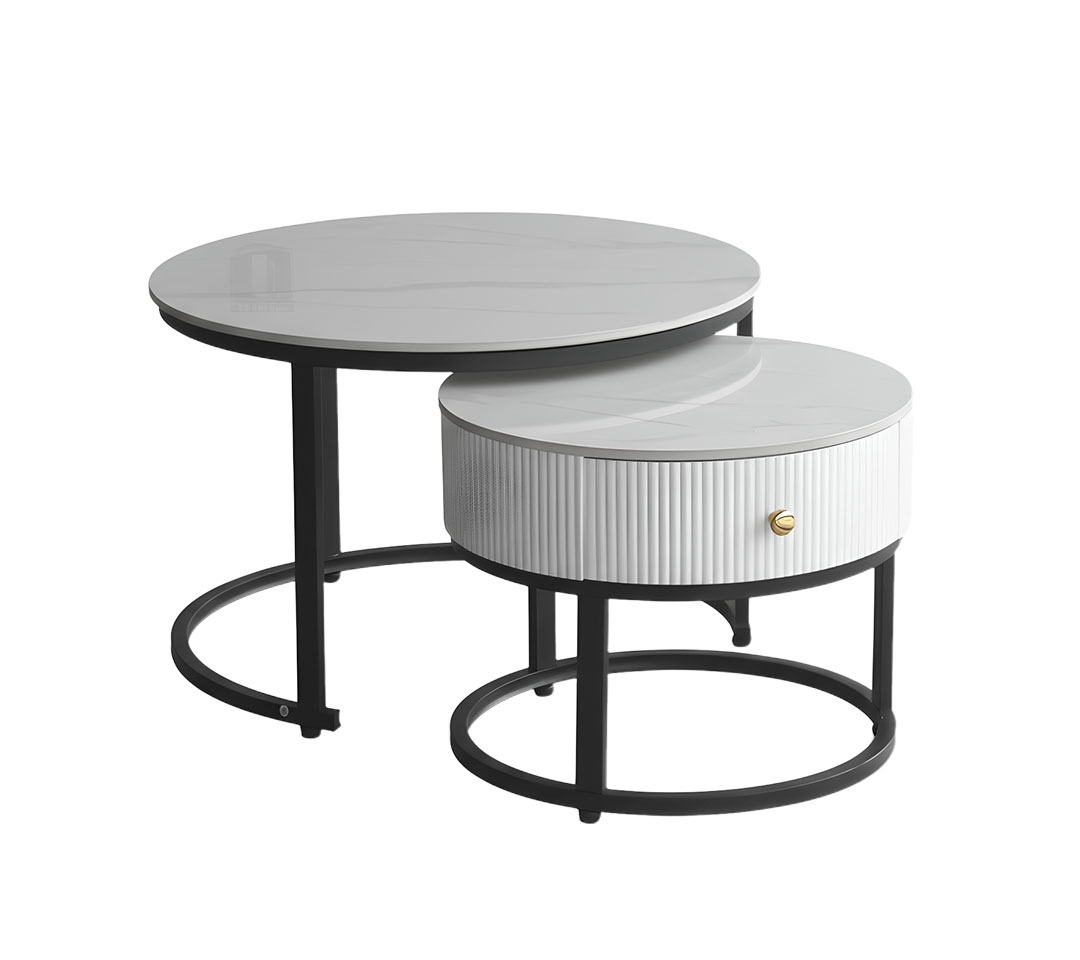 La mesa principal cuenta con una superficie redonda de imitación de mármol que aporta un toque de lujo y sofisticación, mientras que su base de metal negro crea un contraste audaz y moderno. La segunda mesa, más pequeña y versátil, incluye un práctico cajón de almacenamiento con un delicado diseño acanalado y un tirador dorado que te permite guardar objetos de manera discreta y organizada.