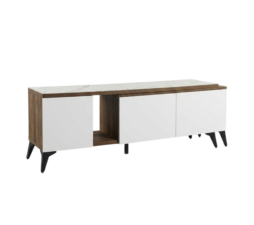 Su diseño combina una estructura robusta con una estética refinada, integrando texturas de madera cálida con frentes en blanco limpio y una superficie superior con acabado tipo Mármol, aportando un aire de lujo y modernidad a cualquier centro de entretenimiento.