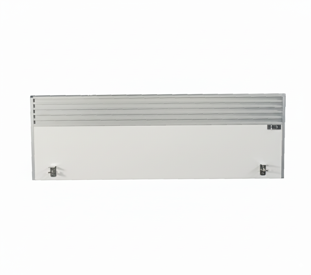 Con unas dimensiones ideales de 120×40 cm, se instala fácilmente sobre cualquier superficie de escritorio, proporcionando una barrera física y visual efectiva sin aislar completamente al usuario. Su diseño moderno combina una base sólida para privacidad en el nivel visual y una sección superior con ranuras que permite el paso ligero de luz y una ventilación discreta.