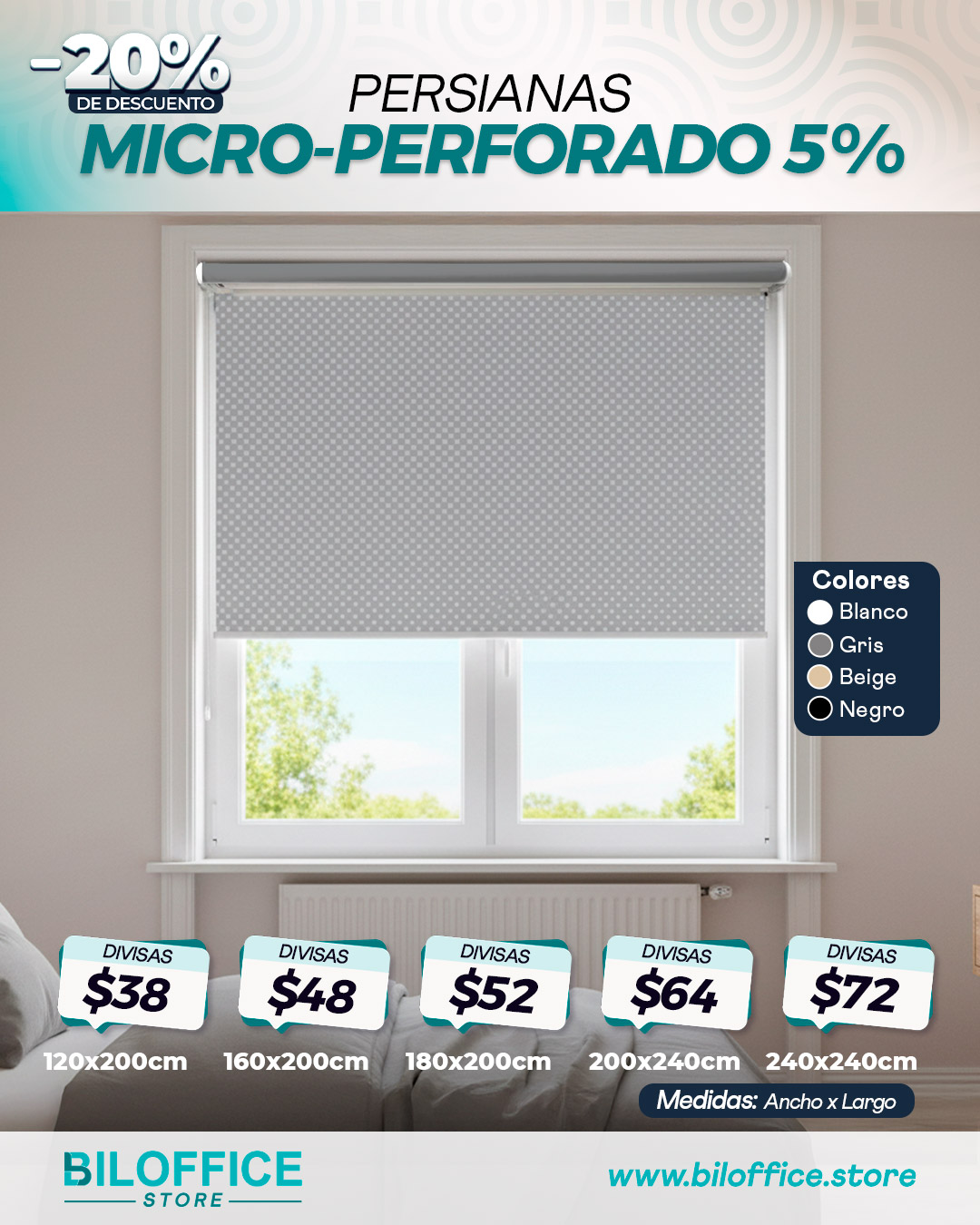 Descubre la fusión ideal de privacidad, protección solar y visibilidad exterior con nuestras Persianas Black Out Micro Perforado 5%. A diferencia de una persiana black out total, esta persiana incorpora una micro-perforación del 5% que permite una visibilidad tenue hacia el exterior mientras bloquea eficazmente los rayos UV y el calor. Es la solución perfecta para salas de estar, oficinas, estudios y cualquier espacio donde se desee mantener una conexión visual con el exterior sin sacrificar el control solar y la privacidad.