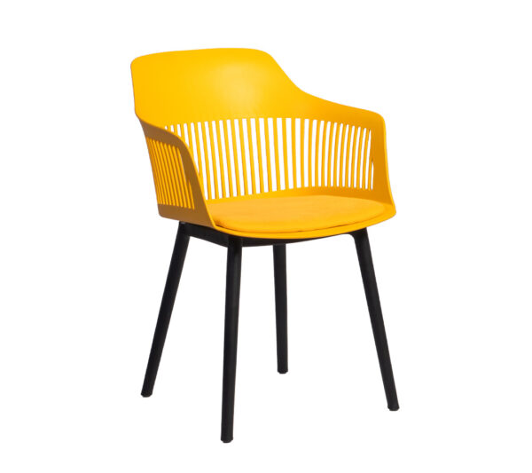 La imagen muestra una elegante silla negra con patas delgadas y un diseño moderno en el respaldo con ranuras verticales, destacando por su simplicidad y estilo contemporáneo. Su presencia en cualquier comedor o espacio de trabajo es sinónimo de un ambiente refinado y con carácter