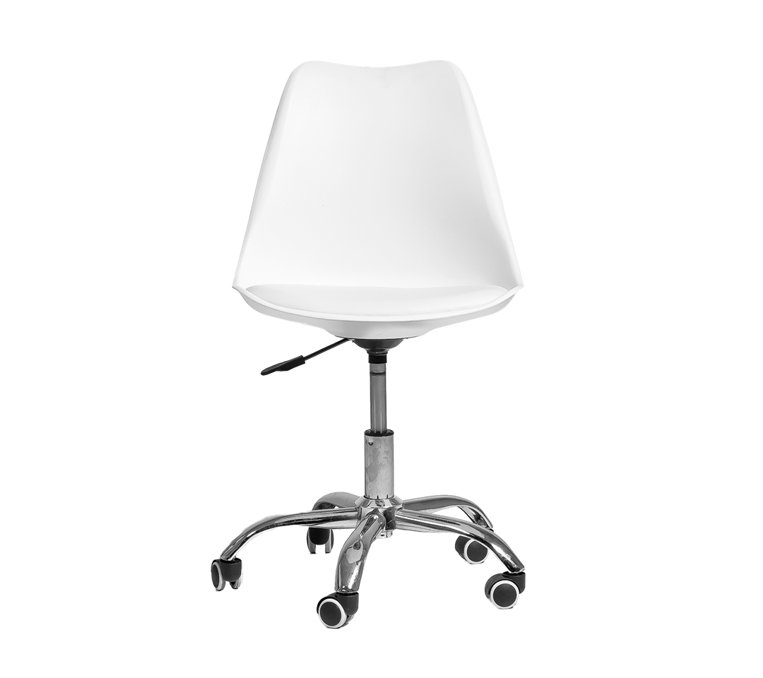 El asiento, finamente elaborado con materiales de alta calidad, ofrece una sensación táctil placentera y una durabilidad excepcional. La base cromada no solo añade un brillo sutil y elegante sino que también proporciona una movilidad suave gracias a sus ruedas incorporadas, permitiendo una transición fluida entre tareas y espacios.